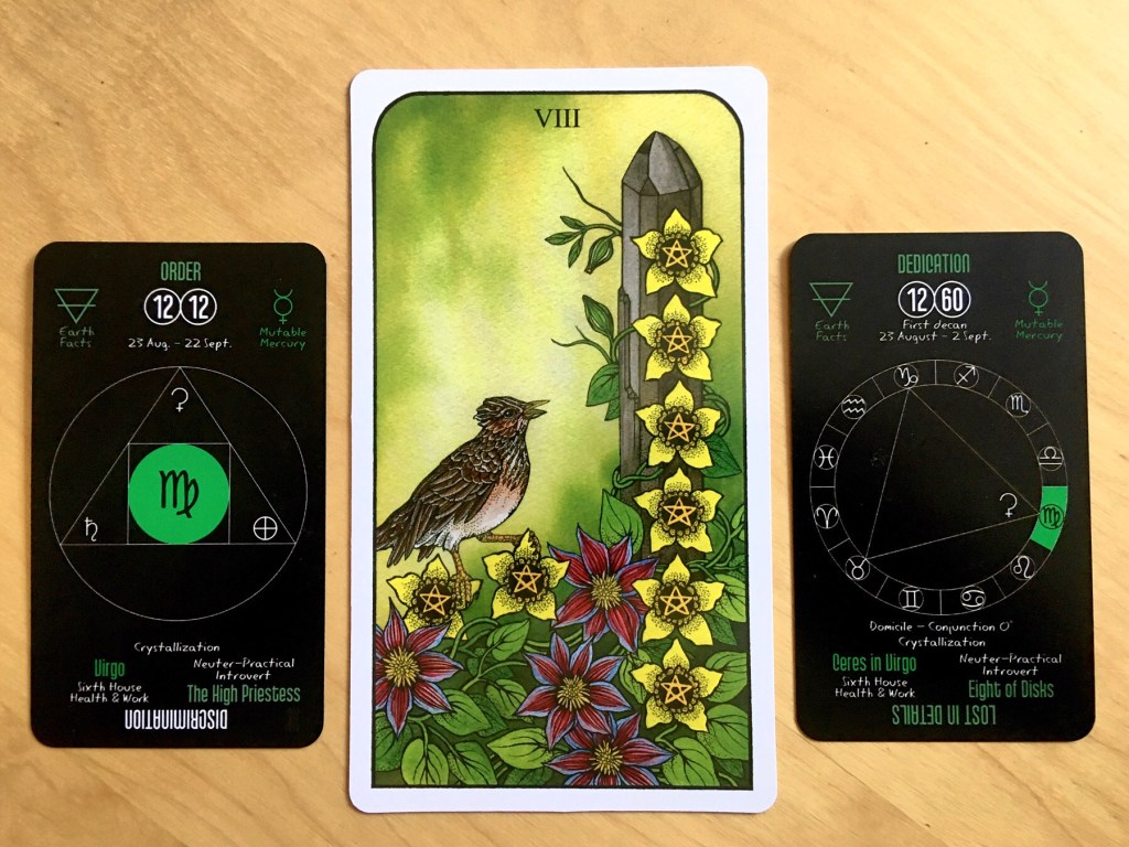 Please note! The assigned astrological decan on the featured tarot cards does not correspond with the current astrological sign and planet placement. The “Unified Esoteric Tarot” and the “Tarot of the Holy Light” have their own astrological correspondences that are used as guides within each card when doing a reading.