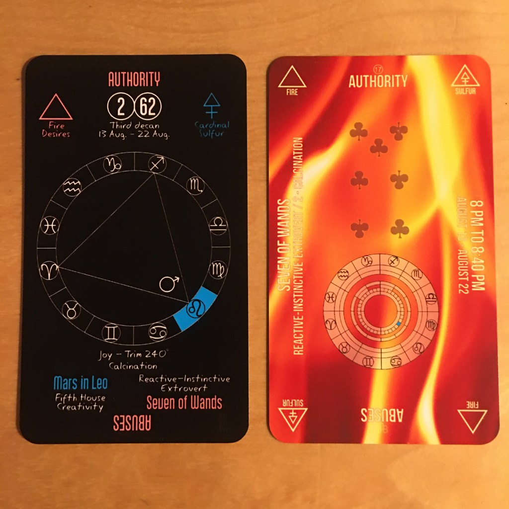FYI, there is no guide book available for either of these decks. There is only a small foldout color pamphlet showing the very minimal basics of the correspondences, etc. All the divinatory information needed is on the cards and both decks can work to complement the astrological aspects when doing tarot readings. The cardstock on the UET and AHT decks both have a weight about 300 gsm and with a semi-matte finish, which make it quite easy to shuffle. I chose the option to have the decks without their boxes and they came sealed and with two velvet bags. The “Unified Esoteric Tarot” came with a black velvet bag and the “Aquarian Hermetic Tarot” in a purple velvet bag.