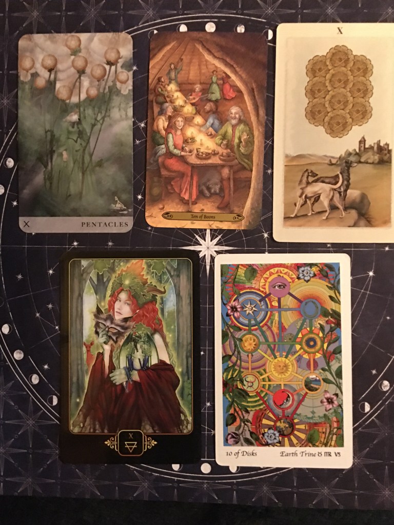 The five cards selected for the “Ten of Pentacles” show the various ways that personal wealth and happiness can be achieved. The “DreamKeepers Tarot” upholds traditional values based on family roots. “Forest of Enchantment” is about sharing your resources with others, no matter how great or small. “Dreams of Gaia” is about personal happiness through being of service to others; respect, trust, and love = personal “Authenticity”. “Pagan Otherworlds” is loyalty and dedication built as a long lasting stable foundation on what has been manifested. “Tarot of the Holy Light” takes the spiritual route through the Tree of Life and showing its complete journey of spiritual fulfillment rather than attaining material wealth.