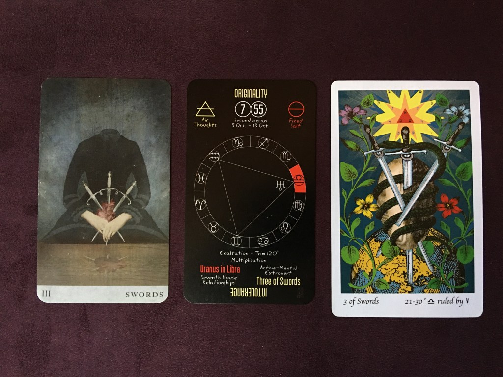 The “Three of Swords” has traditionally been known as the card of emotional hardships, endings, or betrayal. It is a time for SELF TRUTH in acknowledging our fears or losses, and to learn how to better defend from any similar (potential) conflicts.