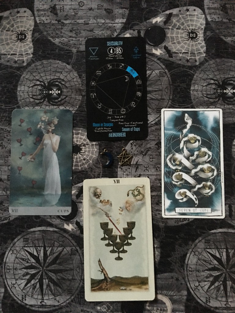 The “Seven of Cups“ is about making choices and taking on the right opportunity. In turn there are risks involved as one enters into a new (unknown) direction. What is it that you fear or desire the most that you are willing to take a chance on or risk not moving forward? It is time to transform and revitalize on what creatively motivates you!