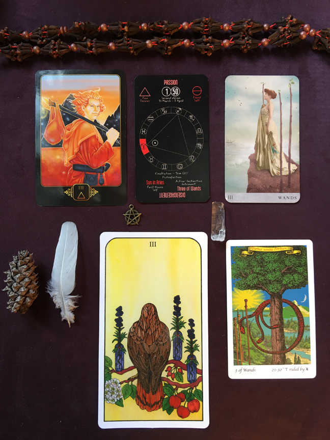 The “Dreams of Gaia”, “DreamKeepers Tarot”, and “Nature Spirit Tarot” share similar “Three of Wands/Fire” perspectives.