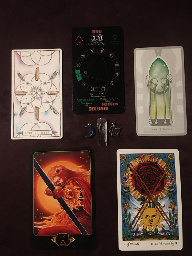 The “Four of Wands“ is about taking time to reflect on what has been accomplished thus far. With well planned out actions and sound choices being made a focussed commitment towards a goal has been set. This is a momentary pause to acknowledge all of your hard work and skills that have been invested in and the stability that has been created toward your endeavors, thus far.