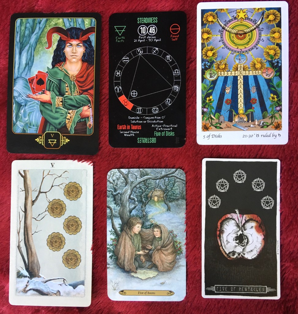 The “Tarot of the Holy Light” has the “Five of Disks” showing the influences of desire versus responsibility. This is about ones own “free will” in seductive circumstances. There is a natural attraction and charm indicated within this card that is a reminder about making disciplined choices with a potential positive result. The Saturn in Taurus influence within this card is the key in taking control of our own free will and not to be persuaded by others. If we let our guard down, we then allow the manipulative factor of a unexpected negative situation to take over and to cause unrest. Remain steadfast in what you know and feel to be in your own best interest.