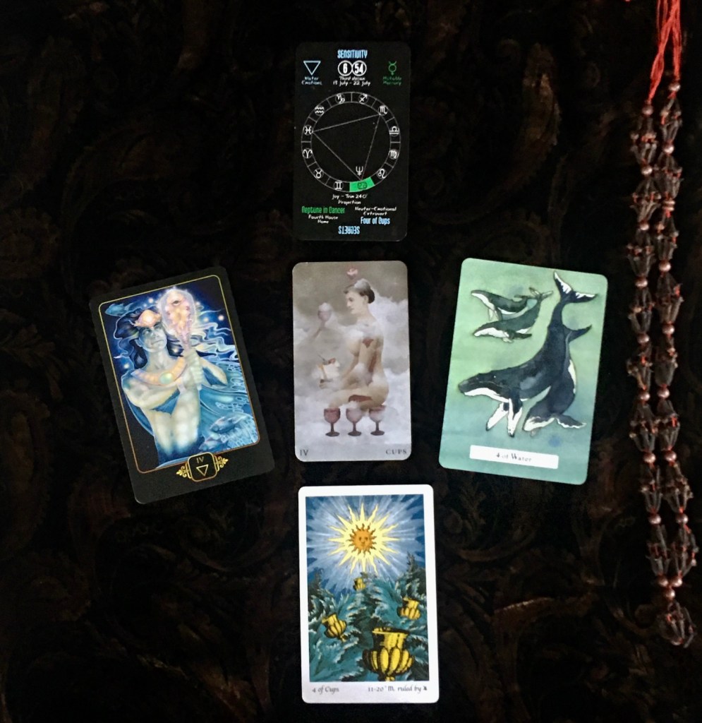 In this third decan with “Neptune in Cancer”, the “Unified Esoteric Tarot” indicates a time of “Sensitivity”. Neptune is a *divinatory planet* that corresponds to the realm of the intuitive, spiritual knowledge, and cosmic unity. When Cancer is placed in Neptune, Cancer’s emotions are heightened and there is a greater empathy toward those close to them, ie family, friends, etc.