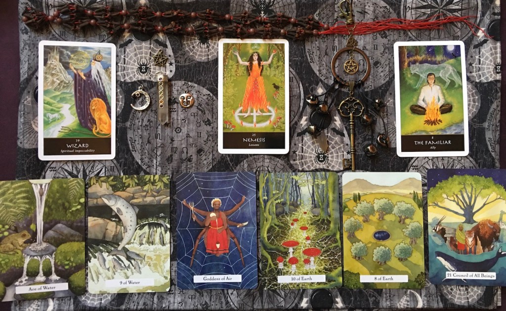 The “Goddess of Air” and the “Ten of Earth” show the inner connection that we have with others through the journey (web) of life. The Goddess of Air shows the multi-faceted ways that we can remain fully present within our relationships while also removing ties that no longer serves us. Ask “how is your relationship with others being of inspiration for you? What needs to be released, mended, or sustained at this time? Know that what is severed can be replaced to make a new connection for the future.