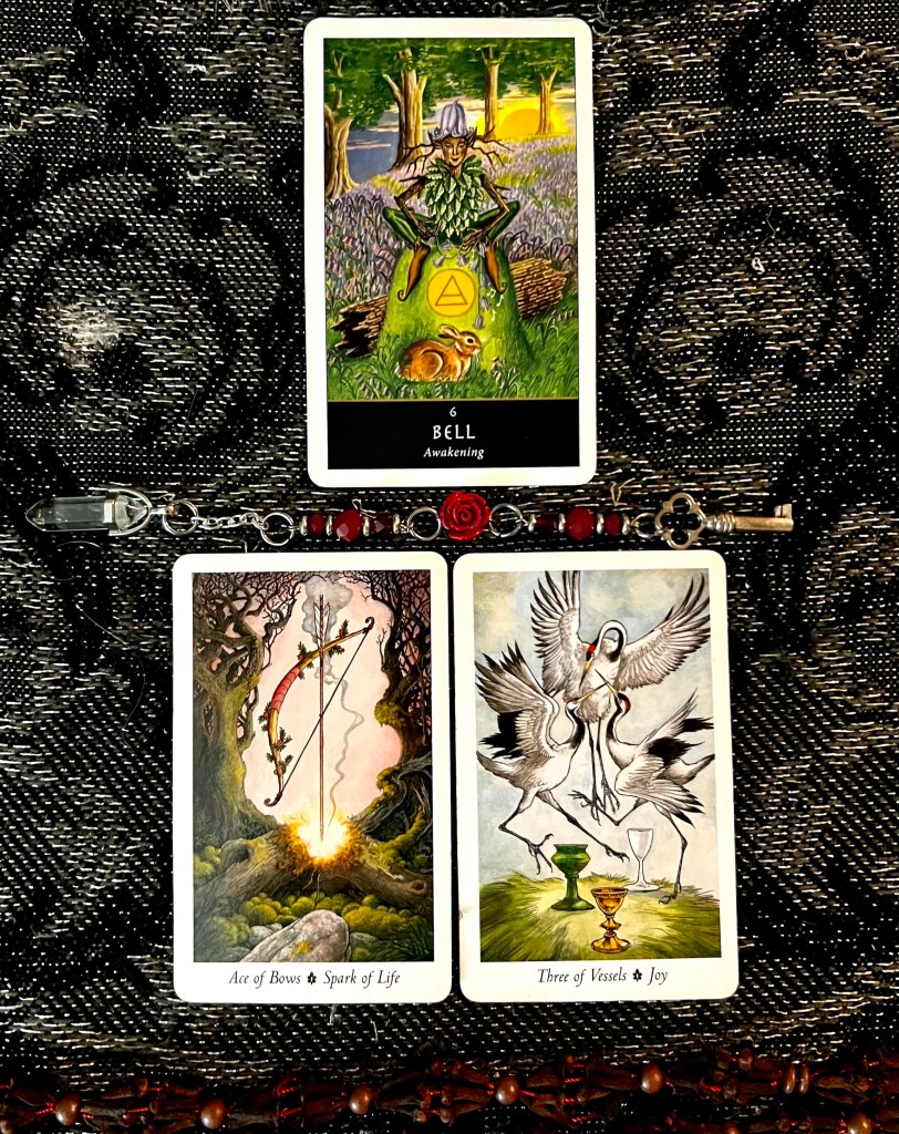 The “Ace of Bows” and “Three of Vessels” shows the creating of self empowerment and the result of harnessing this force in a moment of happiness. It is important to understand the resources that are being used to catapult your desired goal. As this is the early stage of creative energy be open to whatever comes your way as fire is always shapeshifting and moving in different directions. Let this energy become a form of inner release and celebration.