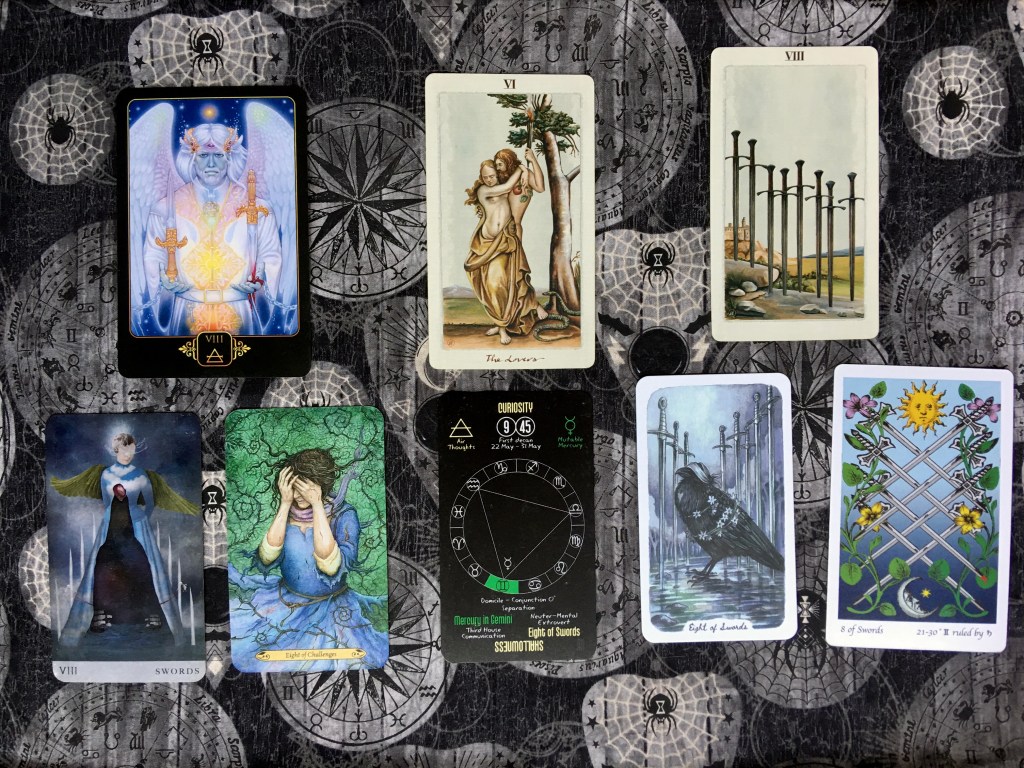 The “Eight of Swords“ is seen as a mental stalemate or conflict; whether self-imposed or placed upon. This can be read as being too overwhelmed in our thoughts and not being able to make a decisive motion to move ahead. The inner fear and self doubt can cause paralyzing thoughts that one cannot see what lies ahead. The ideas of potential risks and uncertainty needs to be overcome and to be replaced with resolutions and possibilities.