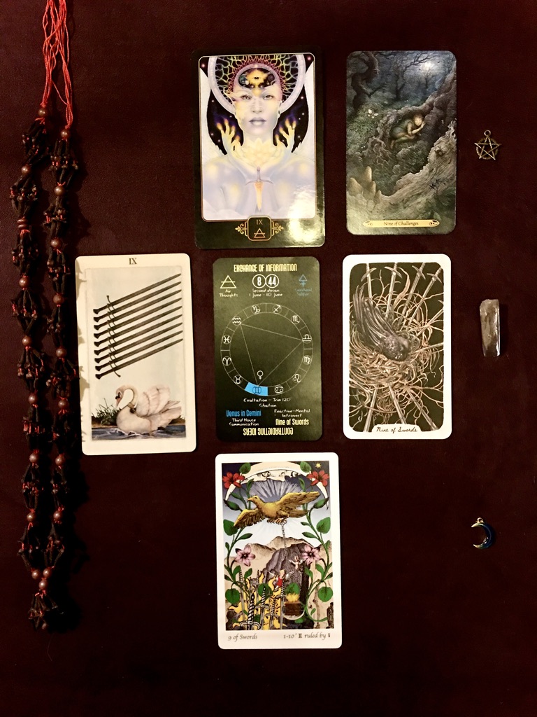 The “Nine of Swords“ is about the (sub)conscious mind and facing our inner struggles and fears of uncertainty. This can be placed either upon ourselves or from the negative energy that can be incited upon from others. This is a reminder about the power of the mind when it comes to the conflicts of thoughts and allowing your subconscious Self to get the worst out from you. The planet Mars, and its major arcana archetype of the “Tower, is associated with the Nine of Swords as the breaking down of conflicting past (karmic) actions and thoughts. Ask yourself, “how would one face these challenges directly so that the Self can move ahead with confidence”?