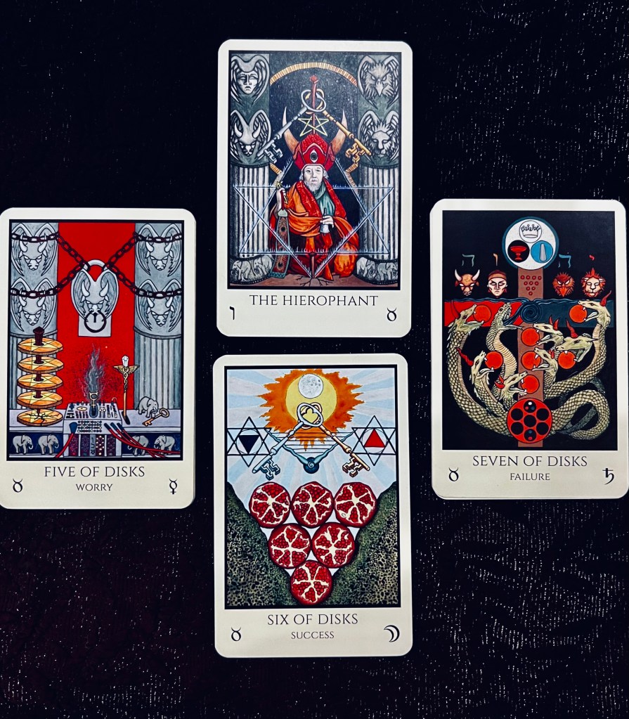 “Five of Disks” (Mercury) – For me, this represents how the mind can allow matters to take control and cause a great deal of unnecessary worries. The master controller (Magus/Mercury) has vanished from this once active environment and has left a space filled with no security or direct guidance. But as in all the “5’s” in the minor arcana, there are tools/resources that can be used to turn this scenario into something greater.