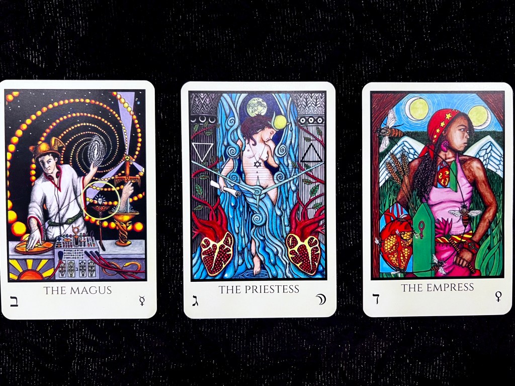 THE PRIESTESS (MOON): As I type this, I’m looking at the Middle Pillar within the Tree of Life and seeing the 13th path of the Priestess as the conduit of pure enlightenment in Kether, traveling down to the 6th Sephira of Tiphareth (Sun) that reveals the hidden “spiritual beauty” of the Priestess, then leading to the 9th Sephira of Yesod (Moon). The place where intuitive energy is created and regenerates through the spiral water flow that is seen in the Priestess archetype. She is the mediator and translator between these spheres. The alignment between the light and dark, the masculine and feminine, and what is hidden that is yet to be revealed. The Full Moon is her divining crown in Kether. The Priestess is turned away from the Moon and allowing its light to spiritually guide her with messages of esoteric knowledge. She holds the secrets in her right hand in a gesture that a revelation is about to be revealed, There is a soft movement to the flow of water that drapes her, this gentleness is through her inner nature, We are presented with an opportunity to reveal the spiritual mysteries and to transform aspects of the ‘Self. The Priestess has opened her heart, if you are ready to listen.