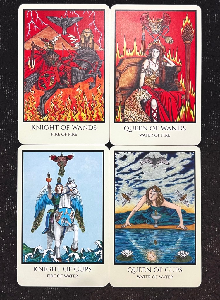 KNIGHT OF WANDS: “King of the Spirits of Fire” → Father of Fire (Yod of Yod). Governs 20° Scorpio – 20° Sagittarius. His card of triumph is Sagittarius inspired (motto is “I Aim”), “Art/Temperance” while his shadow card is of Scorpio’s “Death”. The associated decanic cards are: 7 of Cups(Debauch/Venus in Scorpio), 8 of Wands (Swiftness/Mercury in Sagittarius), and 9 of Wands (Strength/Moon in Sagittarius). For me, the Knights are Cardinal/Mutable. They initiate the action and adapt to its elemental force.