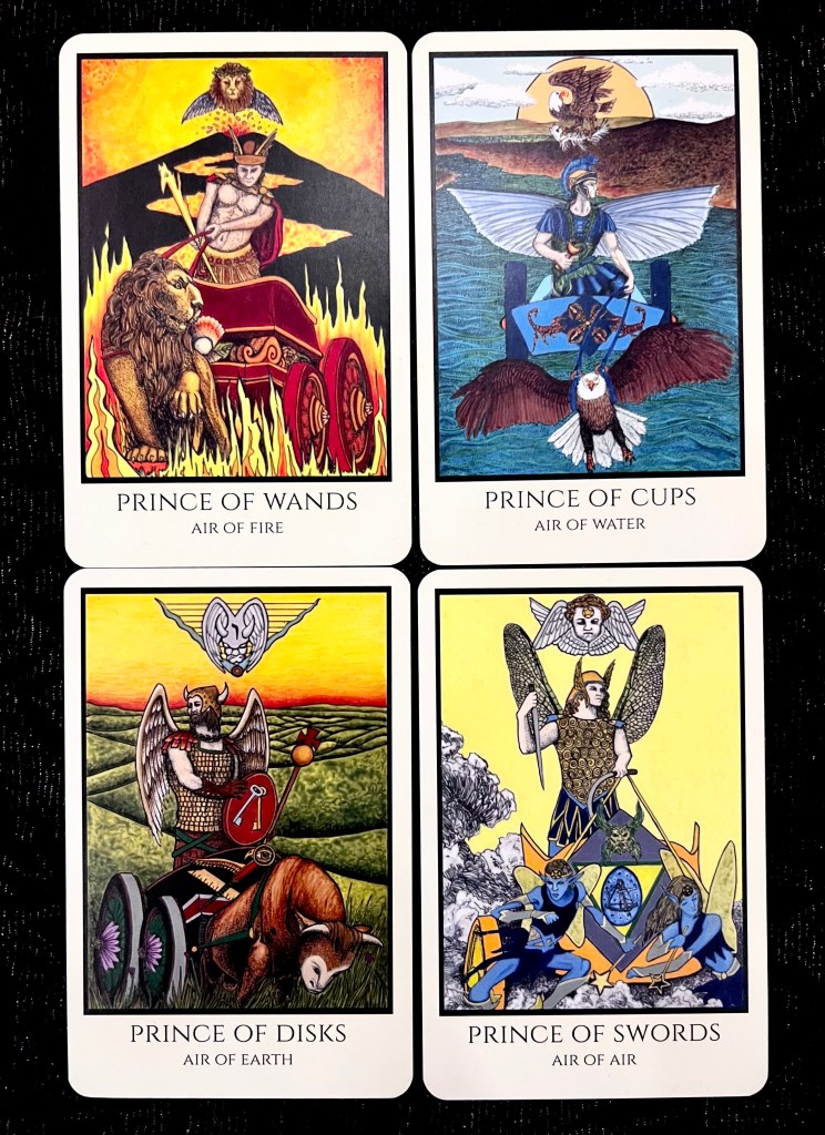 The Princes use their intellect to create harmony (Tiphareth) between extreme opposite energies. His Chariot is driven by the power of his father’s Will (Knight) which is guided by one of the primal entities of the fixed signs. The formation of the Chariot itself is inherent of his mother’s steadiness and receptivity of their surroundings. In a sense, the Princes can been seen as elemental mediators for the court cards.