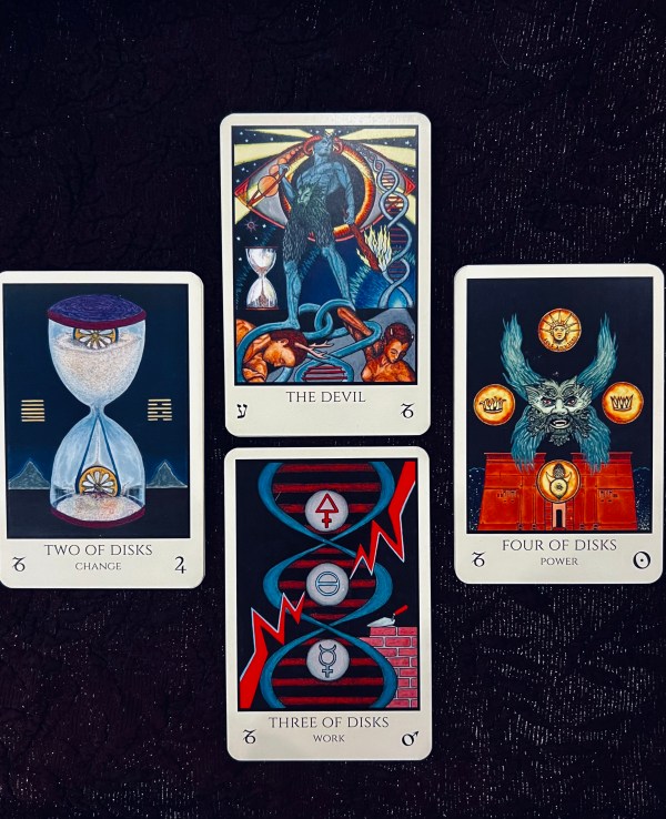 Tabula Mundi Tarot: Capricorn Decan (2-4 Disks) + The Devil August 17th 2025