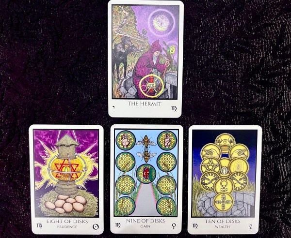 Tabula Mundi Tarot: Virgo Decan (8-10 Disks) + The Hermit, September 7th 2025